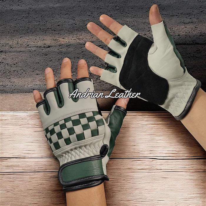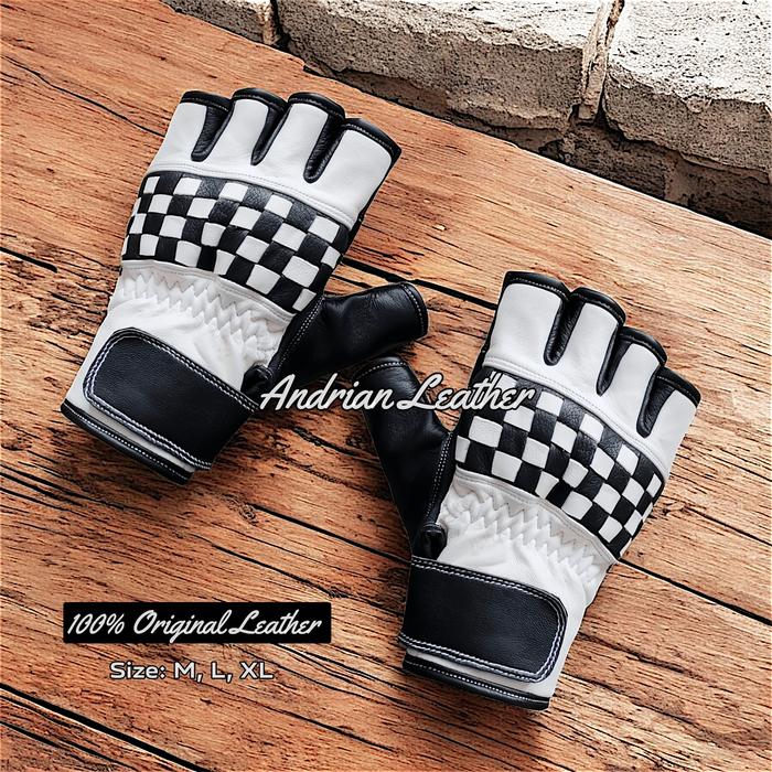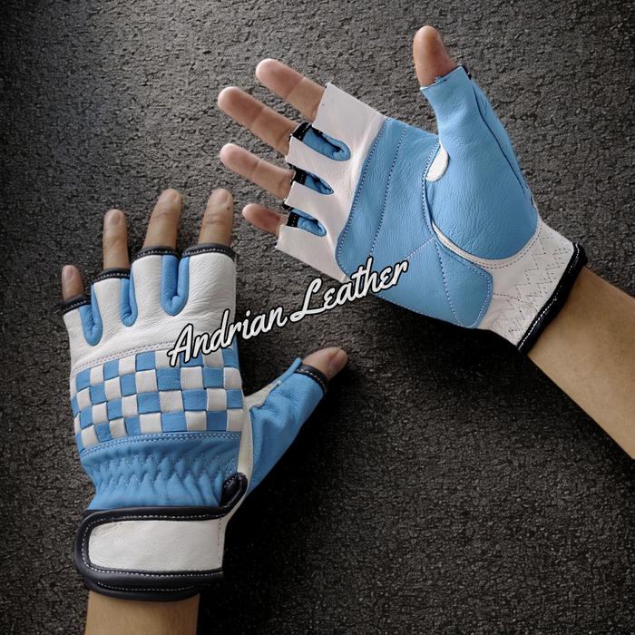 PROMO TERBATAS SARUNG TANGAN KULIT ASLI RETRO HALF FINGER CHECKERBOARD CORAK CATUR BABY BLUE L