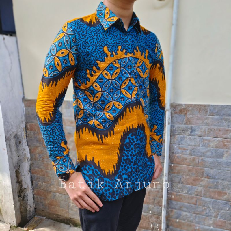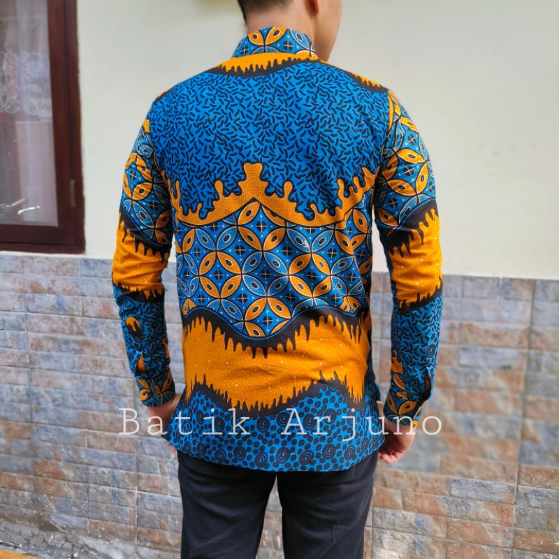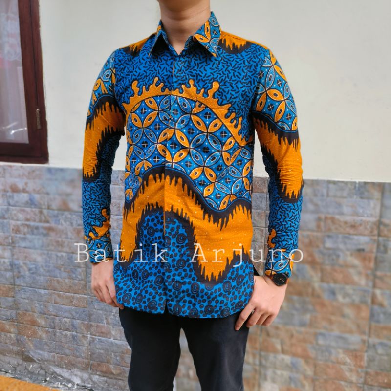 baju kemeja batik pria lapis furing ekslusive lengan panjang katun kawung Biru