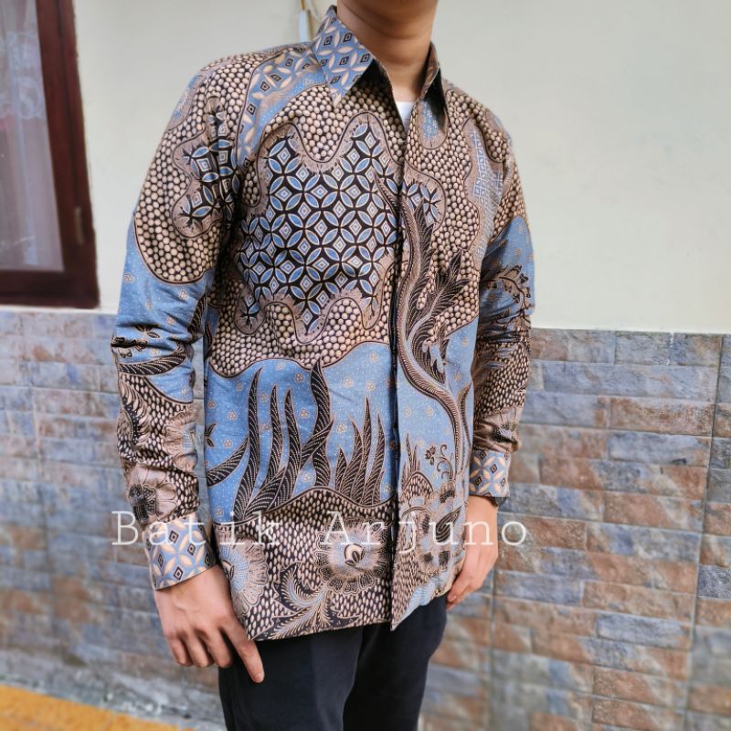 KEMEJA BAJU BATIK PRIA LAPIS FURING EKSLUSIVE LENGAN PANJANG KEMBANG KAWUNG Biru Wardah
