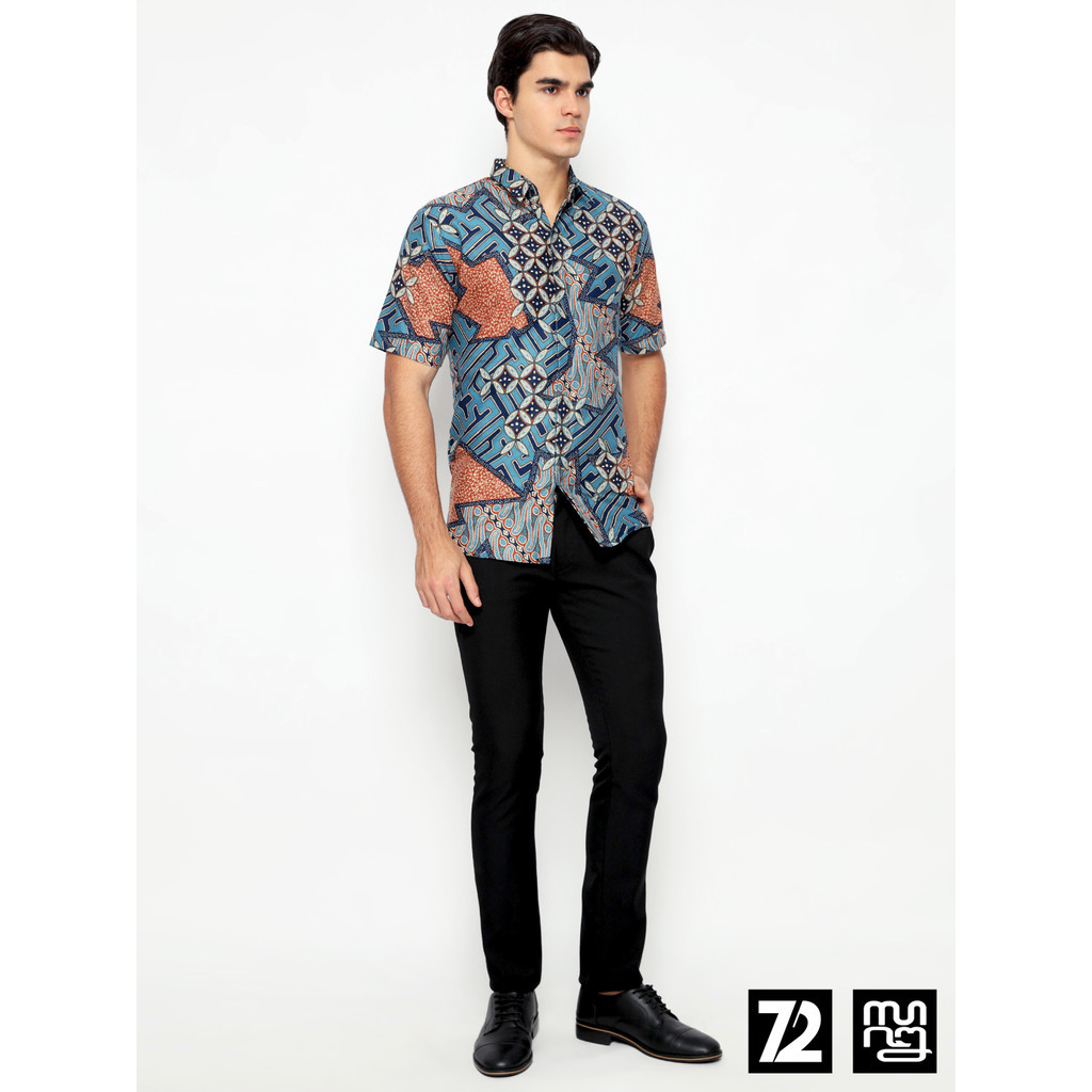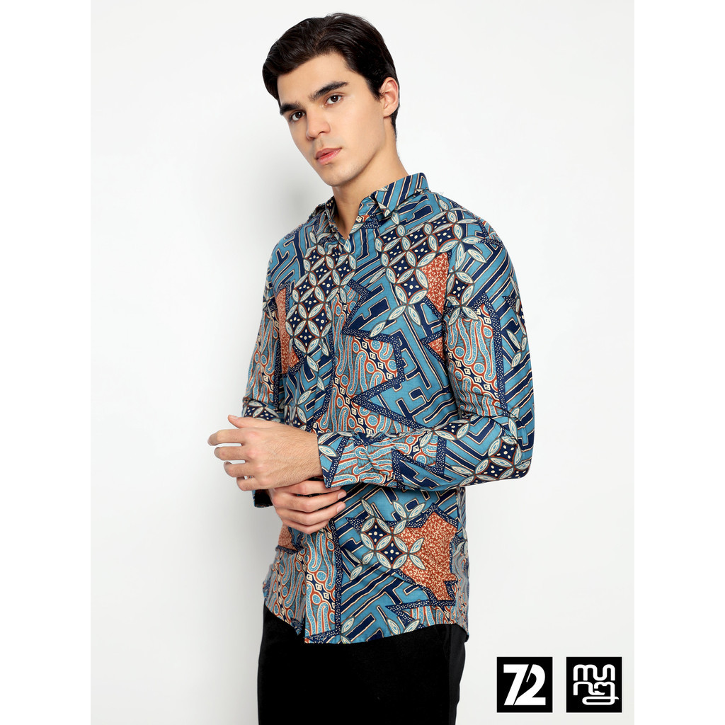 BATIK PRIA LENGAN PANJANG Kawung Seling Parang Slimfit Premium Biru Putih Orange 725104 Cap 72 - Baju Kemeja Atasan Paka
