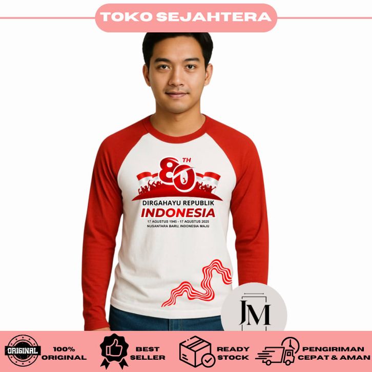 Kaos Oblong Dewasa Model Raglan Lengan Panjang Unisex Laki Laki dan Perempuan Gambar Kemerdekaan 17 Agustus 2025