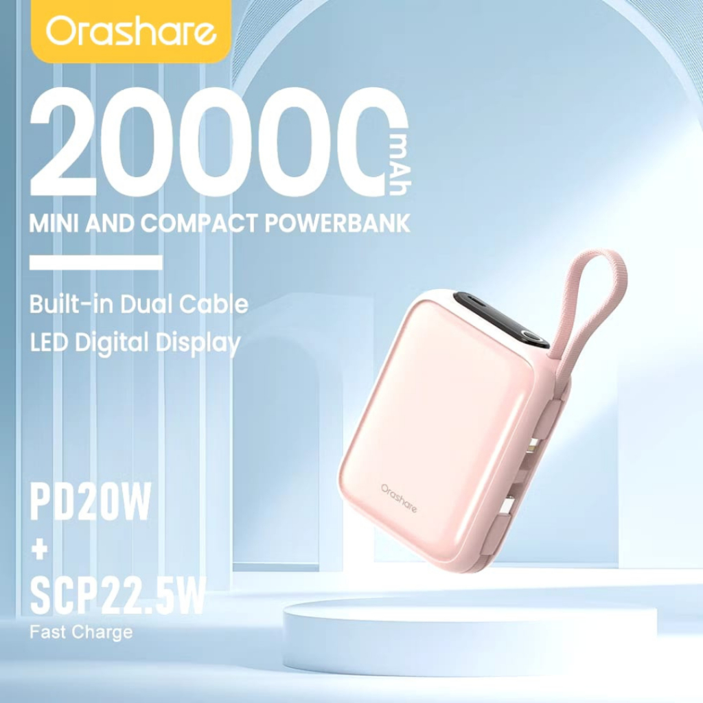 Orashare PCM20 Mini Powerbank 20000mAh Built In Dual Cable 22.5W Fast Charge Compact and Portable
