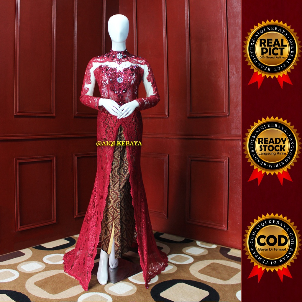 Kebaya Akad Pengantin - Tangan Sambung Leher Marun (Ekor Sedang)