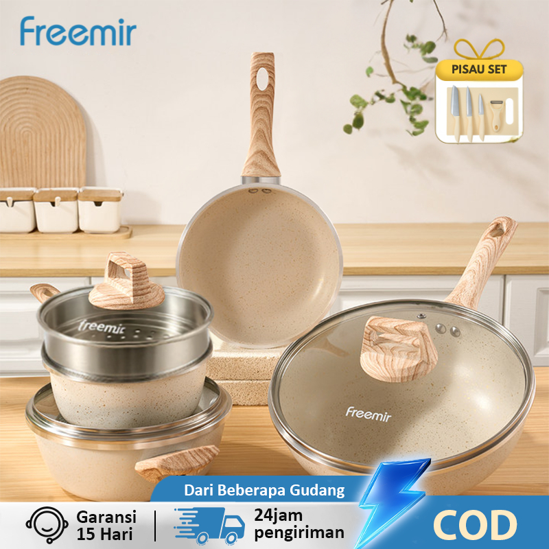 𝙎𝙥𝙚𝙘𝙞𝙖𝙡 𝙛𝙧𝙚𝙚 𝙝𝙖𝙙𝙞𝙖𝙝 FREEMIR WAJAN PANCI SET BEIGE 7PCS 26/20/20/16 GRANITE ANTI LENGKET TUTUP KACA