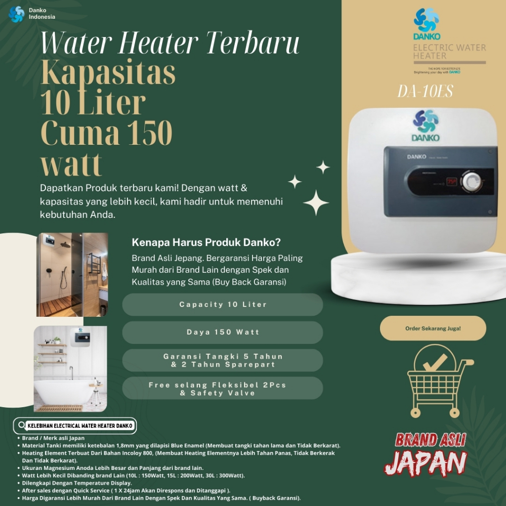 Water Heater DANKO JAPAN 10L 15L 30L - Pemanas Air Listrik Aman, Hemat Daya, Anti Bocor 1 Set Selang