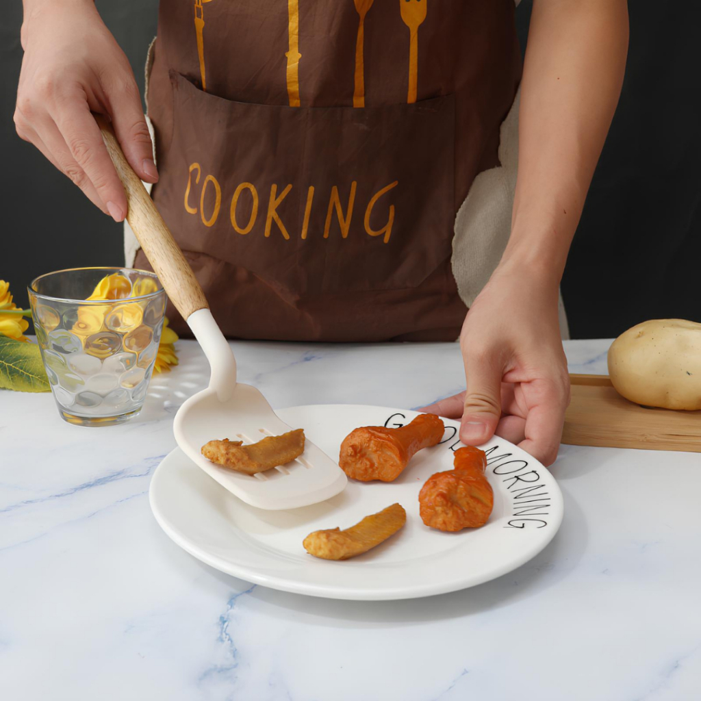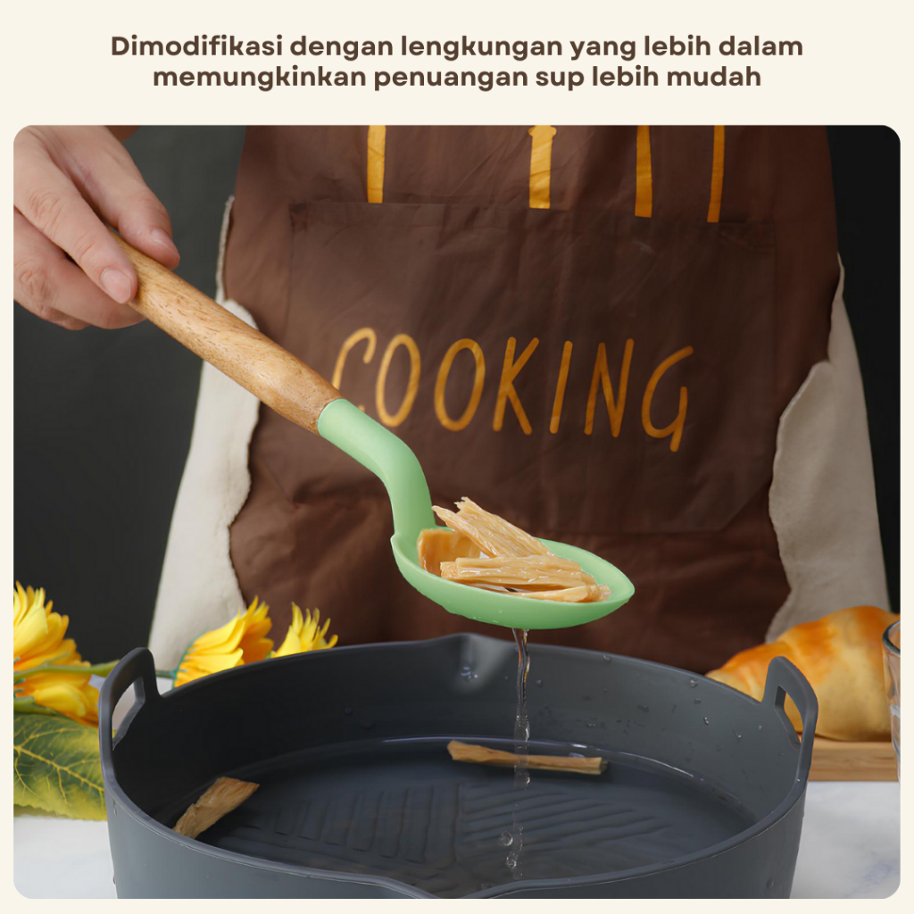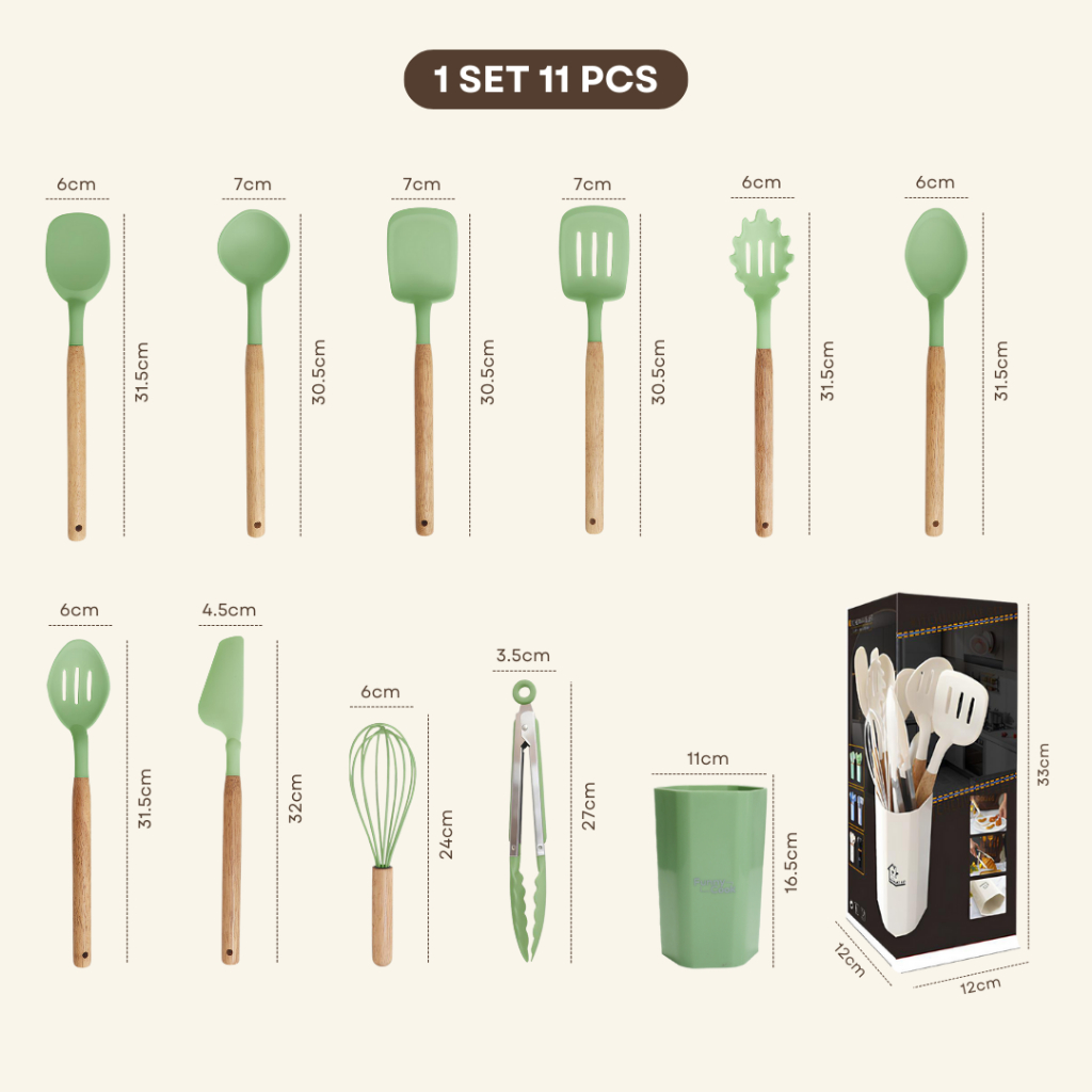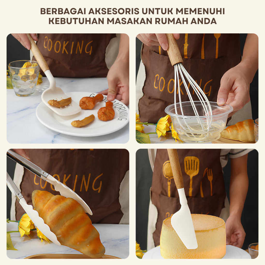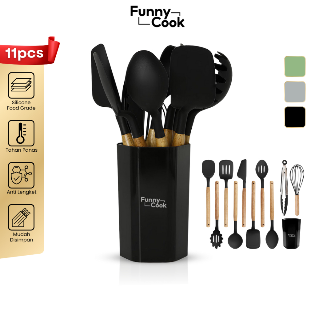FUNNYCOOK SILICONE UTENSIL 10PCS+WADAH SPATULA PERALATAN MASAK SUTIL PEGANGAN KAYU BAKING SET ALAT MASAK