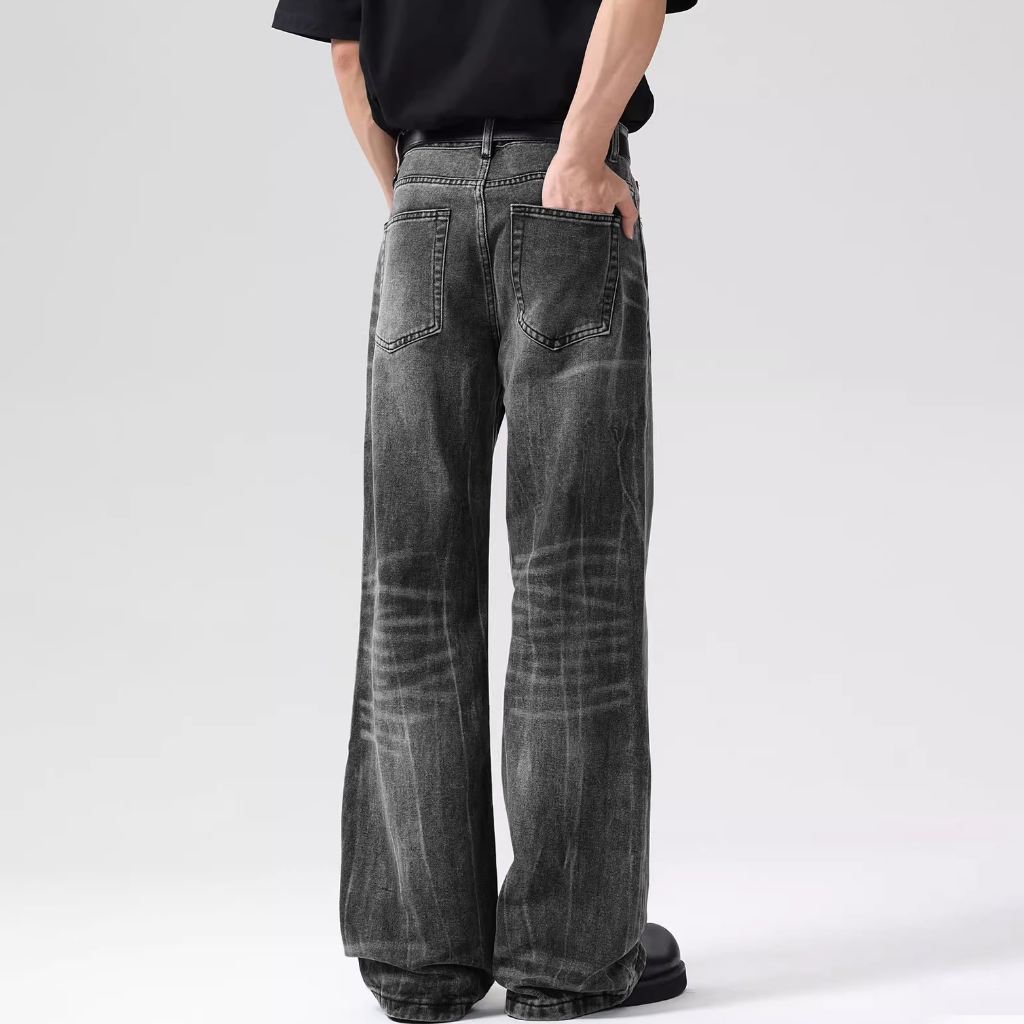 Celana Jeans Pria Hitam Washed - Retro Amerika Motif Petir & Cut Boot