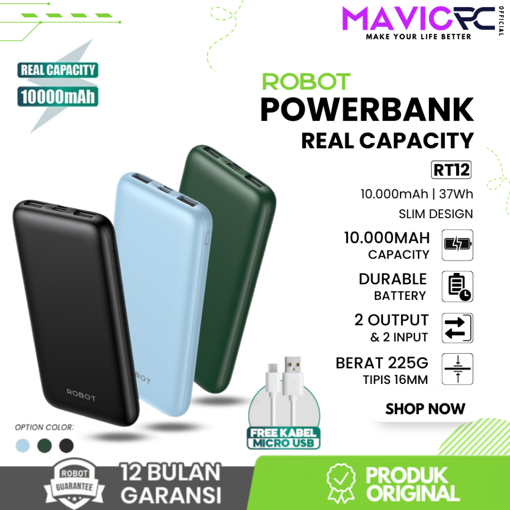 ROBOT RT180S | RT12 Smart Powerbank 10000mAh 12W Dual Input Port Micro USB & Type C | Triple Output USB-C USB-A (New RT180)- Garansi Resmi 1 Tahun