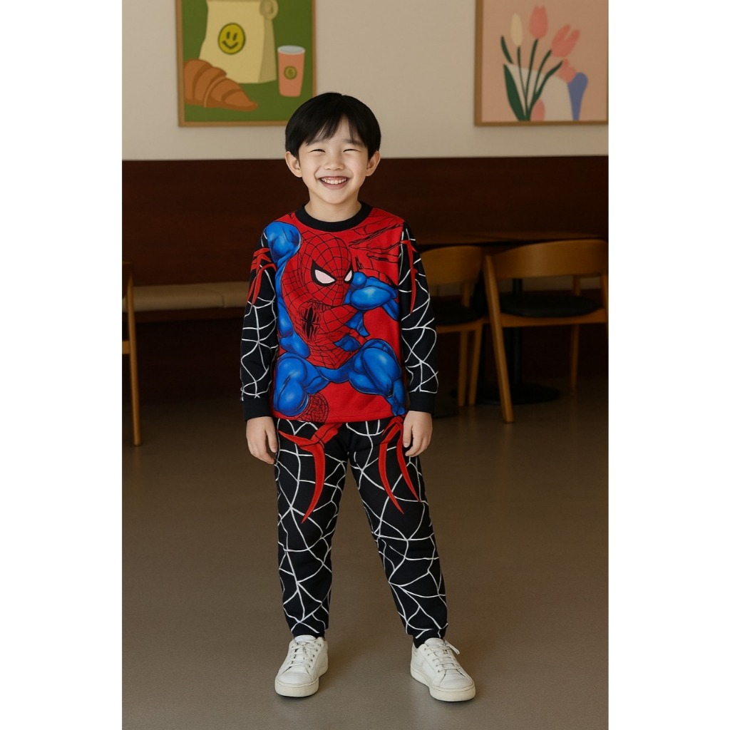 BAJU STELAN ANAK LAKI-LAKI LENGAN PANJANG MOTIF SPIDERMAN BAHAN KATUN USIA 1-10 TAHUN FREE TOPENG