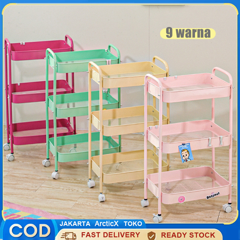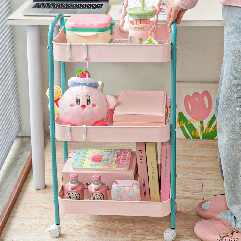 Trolly Rak Penyimpanan 3 Tingkat Warna Macaron Susun Multifungsi Rak Troli Plastik Steel Rak Penyimpanan Dengan Roda Pe