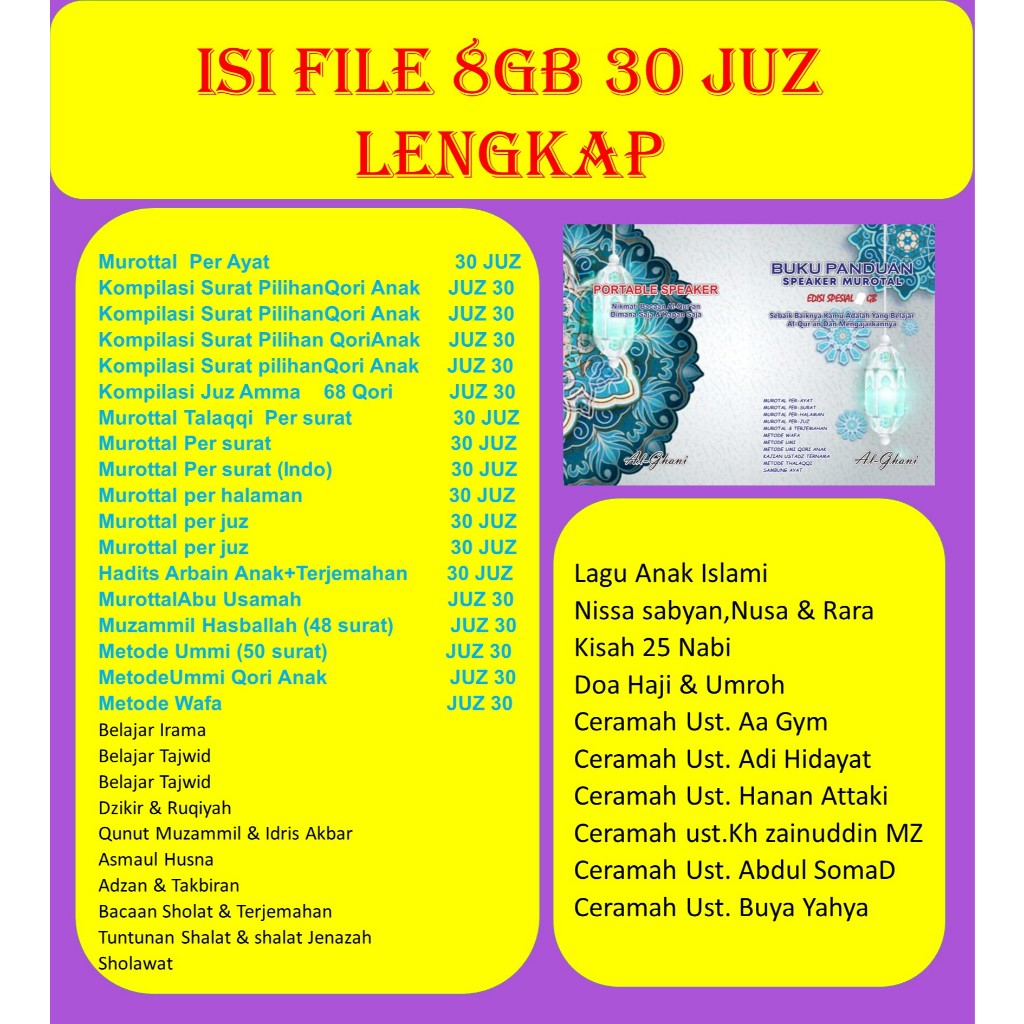 (GHANI)SPEAKER ALQURAN 30 JUZ MEMORI 8GB & 16GB +BUKU PANDUAN (BISA REPEAT)