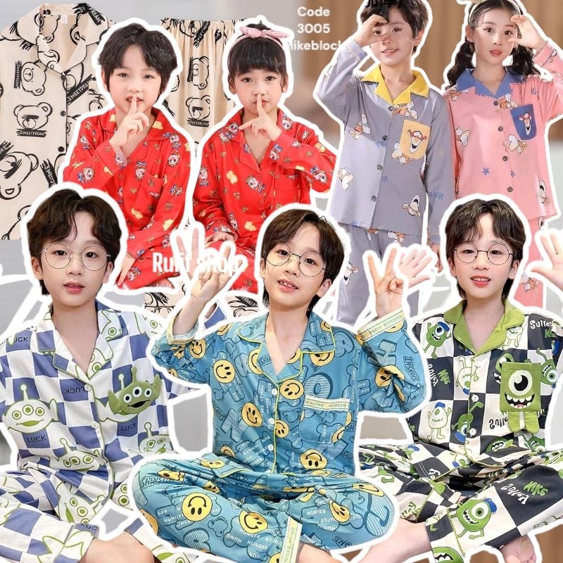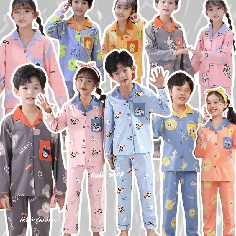 RULIF SHOP BAJU TIDUR ANAK LENGAN PANJANG UNTUK 5-14 TAHUN IMPORT PIYO/STELAN ANAK LAKI LAKI/STELAN ANAK PEREMPUAN/SETELAN BAJU TIDUR ANAK PEREMPUAN KARAKTER LUCU LENGAN PANJANG CELANA PANJANG KANCING