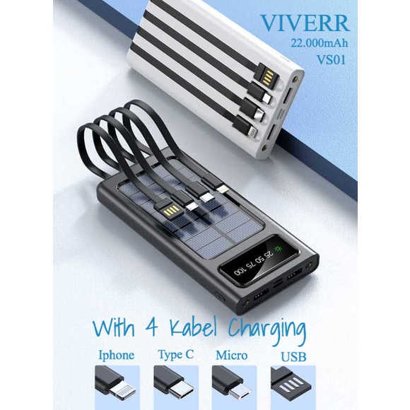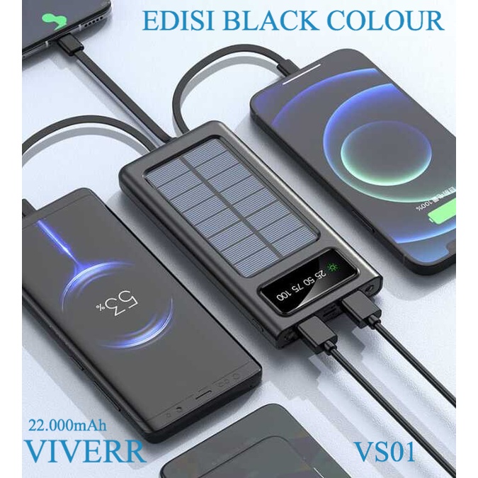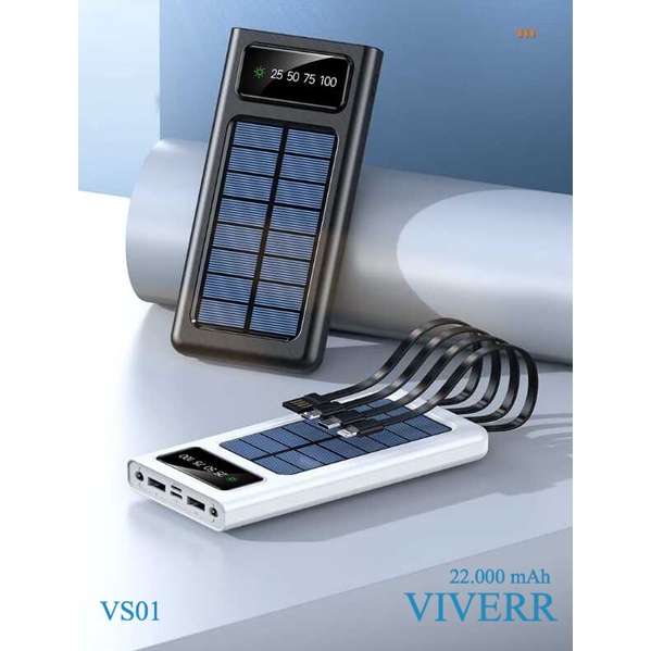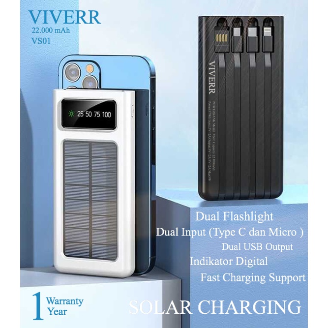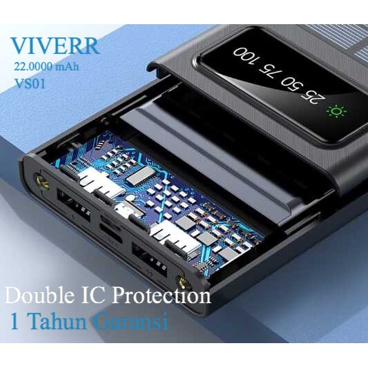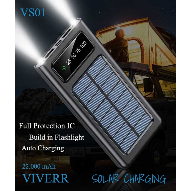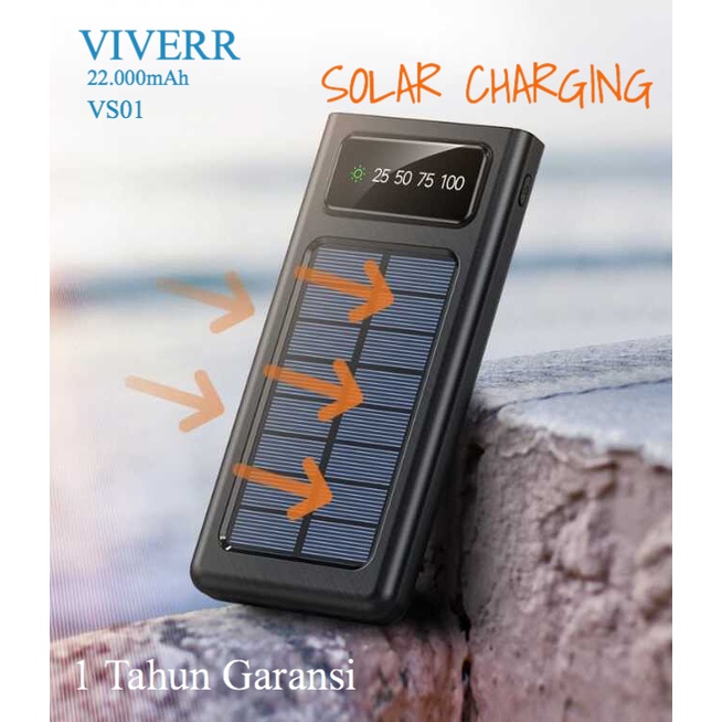 Powerbank VIVERR Solar Type VS01 kapasitas 22.000 mAh Bisa mengisi daya lewat Matahari garansi 1 Tahun.