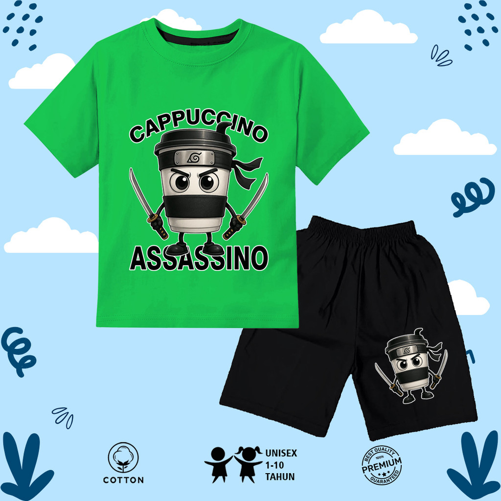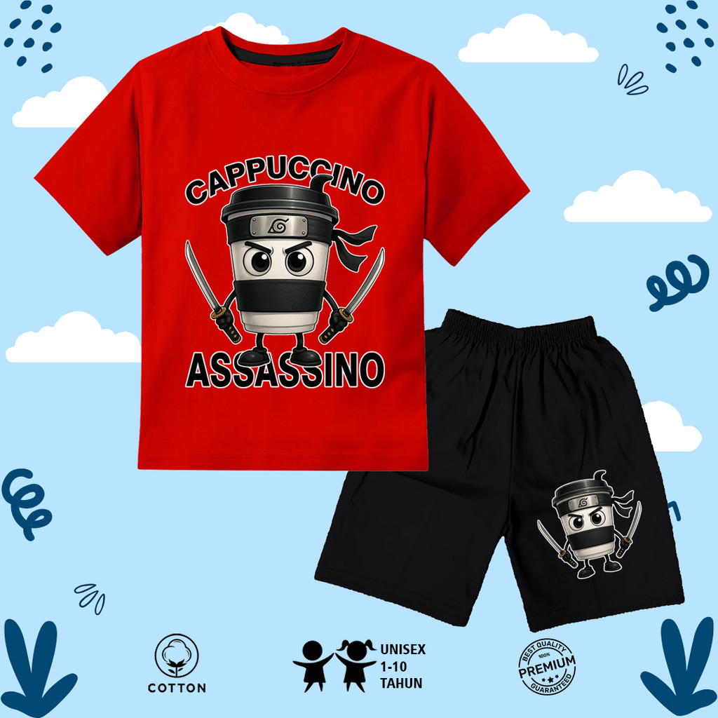 BAJU SETELAN STELAN SET KAOS ANAK COWOK CEWEK LAKI LAKI PEREMPUAN UNISEX MURAH MOTIF ANOMALI CAPPUCCINO ASSASSINO