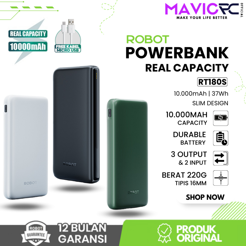 ROBOT RT180S | RT12 Smart Powerbank 10000mAh 12W Dual Input Port Micro USB & Type C | Triple Output USB-C USB-A (New RT180)- Garansi Resmi 1 Tahun