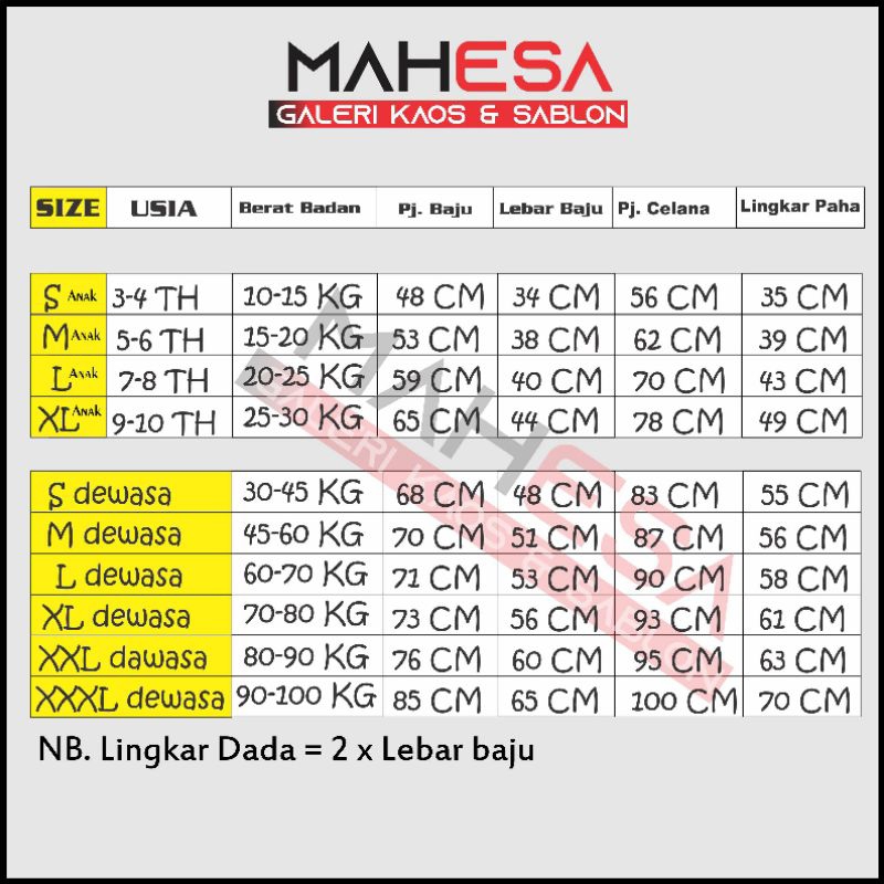 S dewasa, M dewasa, L dewasa, XL dewasa, XXL dewasa, XXXL dewasa, S anak 3-4 th, M anak 5-6 th, L anak 7-8 th, XL anak 9-10 th