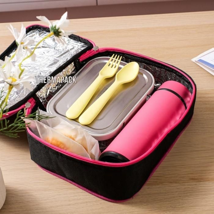 Terlaris ThermaPack Insulated Lunch Box | Tas Bekal Makan | Lunch Bag Yooyee - Hitam+Pink Keren