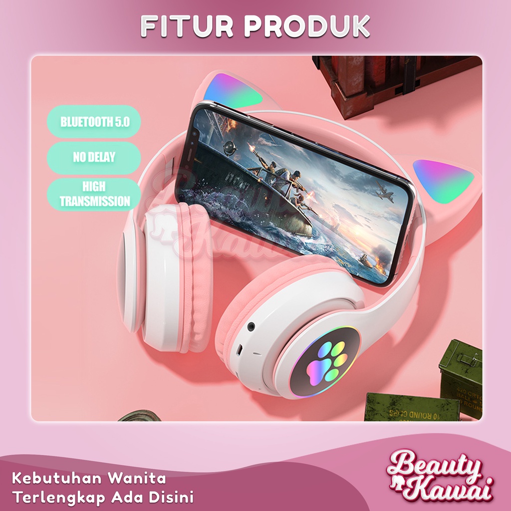 Headset Kucing LED TWS Bluetooth 5.0 Headphone Extra Bass