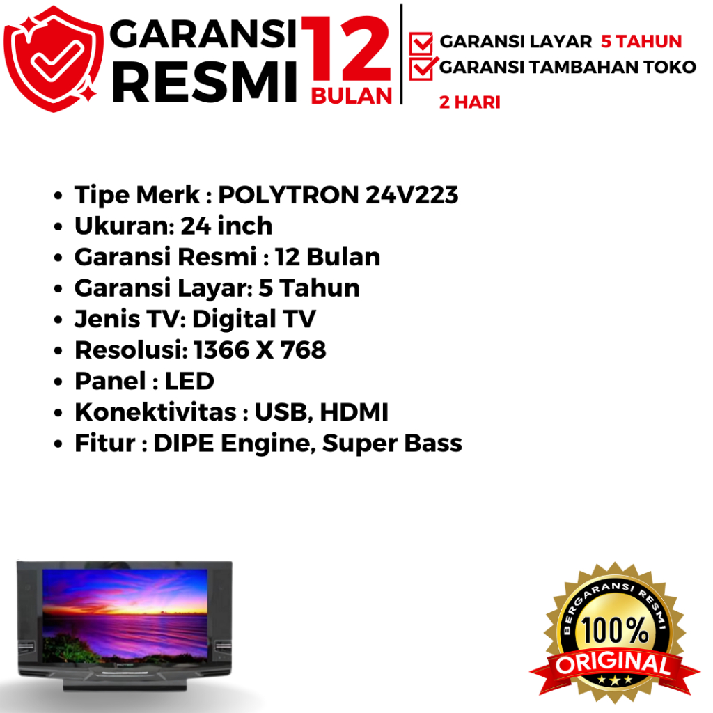 POLYTRON TV SEMI TABUNG DIGITAL 24V223 24 INCH Resolusi HD - USB Multimedia