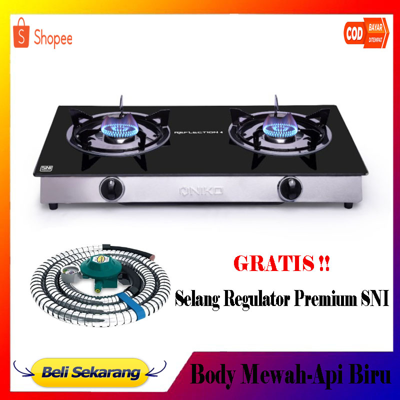 Kompor Gas 2 Tungku Promo NIKO Reflection 4 Kompor Kaca Tempered Glass 7mm Freee Slang Regulator SNI Super Murah
