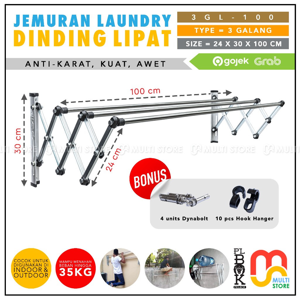 PLBOK Jemuran Baju Dinding Lipat Stainless 100 CM 3 Galang Kuat Murah Anti Karat PELBOK