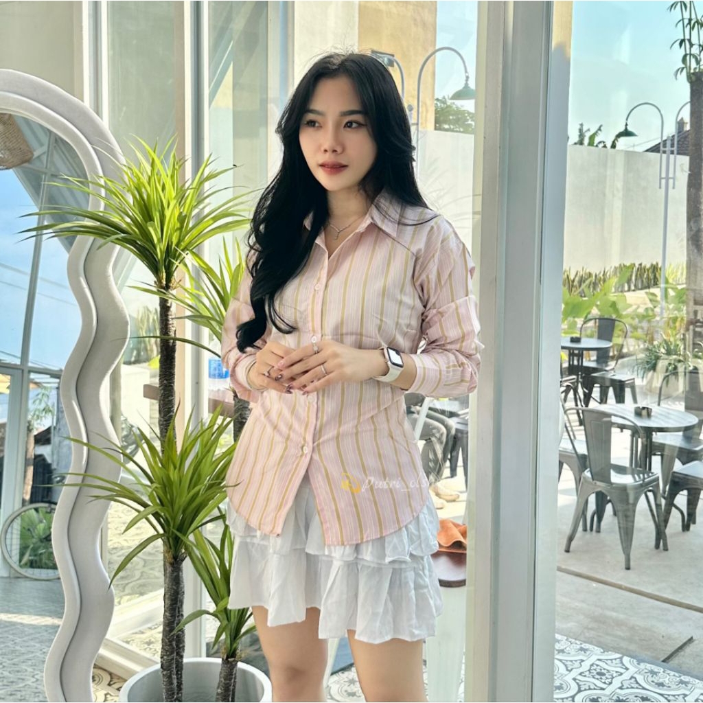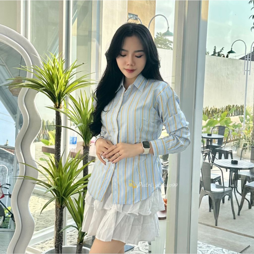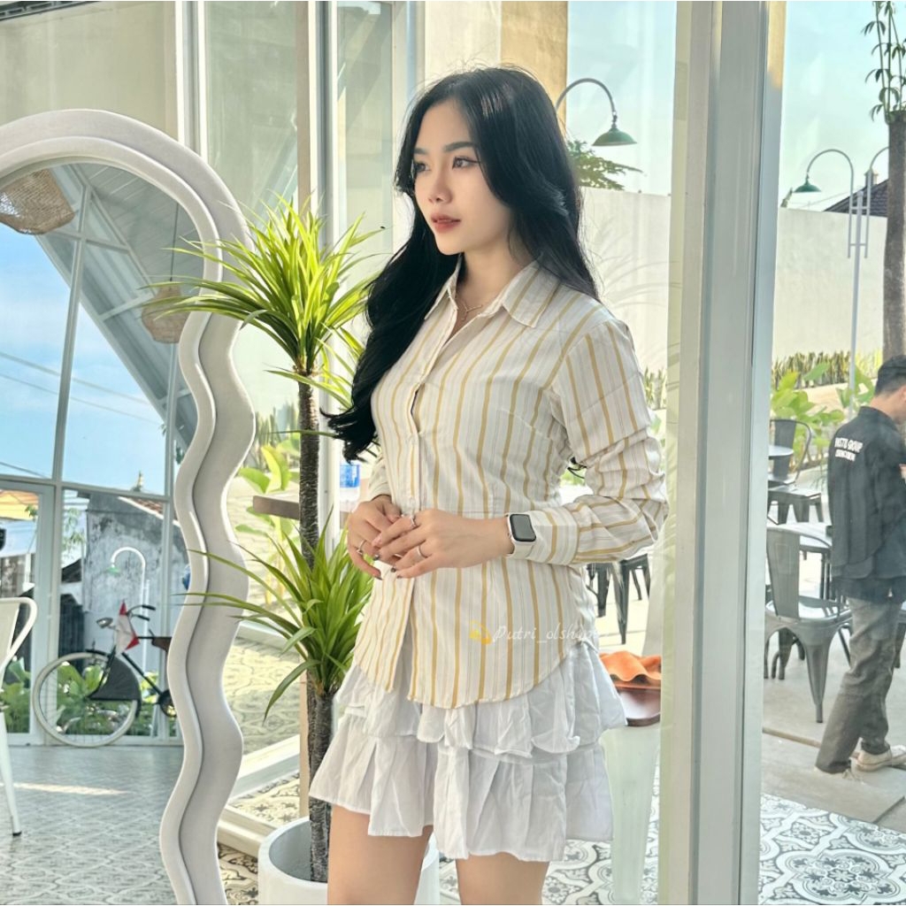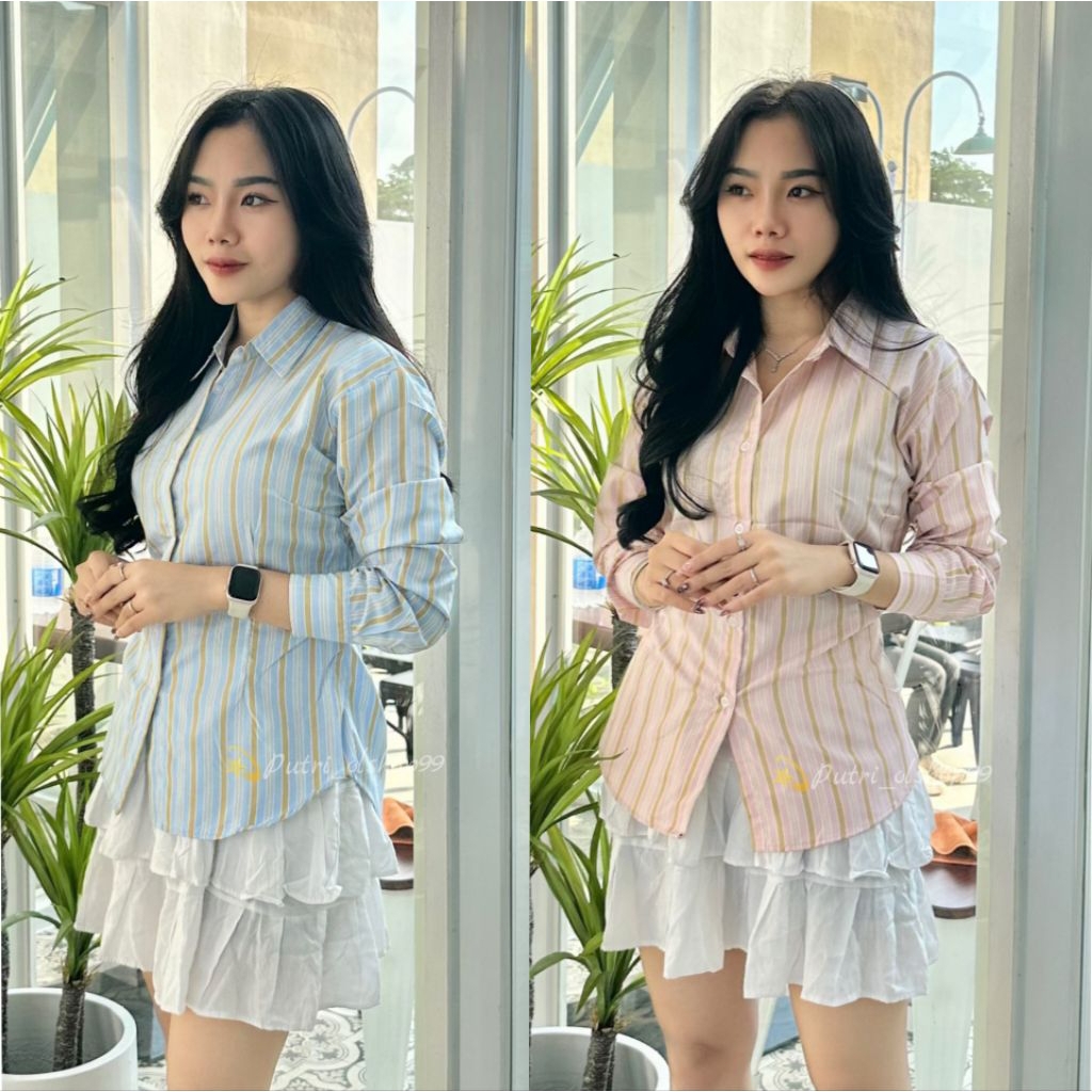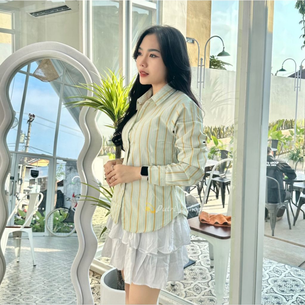 Putri Girl Boss Fitted Shirt | Kemeja kerja wanita fit garis stripe karet Lembut pink hijau biru