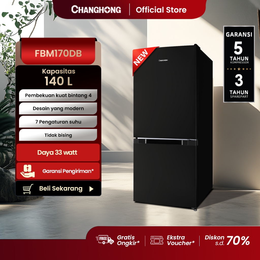 [Mall] Kulkas 2 Pintu Changhong (Bottom Mounted Refrigerator) Lemari Es Kapasitas 140 Liter FBM170DB Black Original