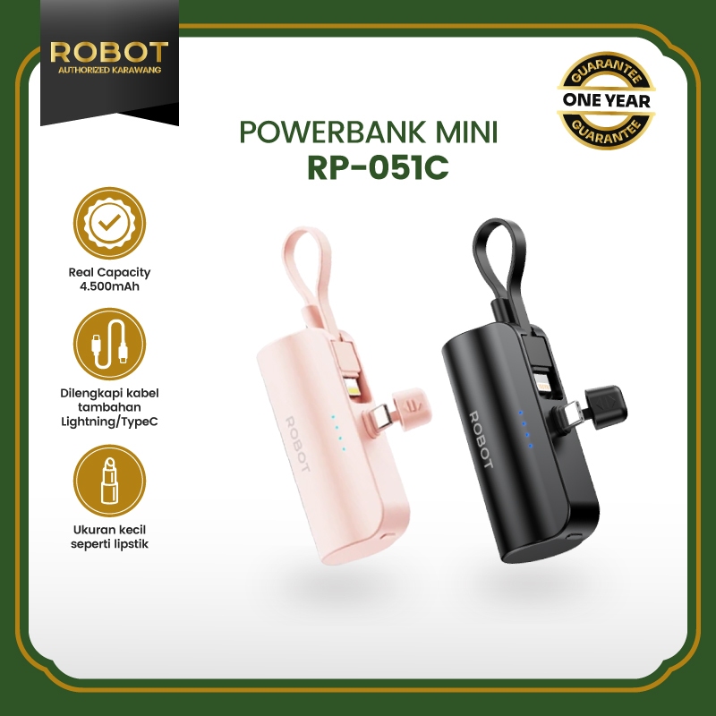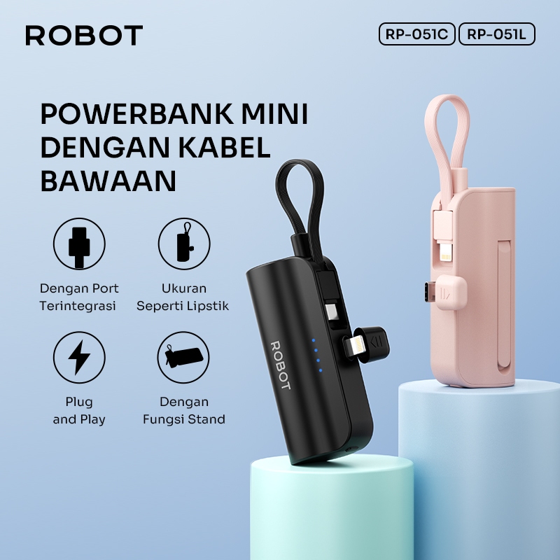 ROBOT POWERBANK MINI 4.500MAH PORT TYPE-C LIGHTNING BUILT IN CABLE STAND FUNCTION PORTABLE TRAVEL SIZE BLACK PINK RP-051L