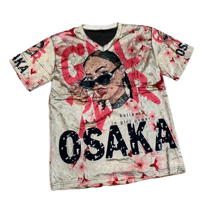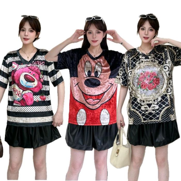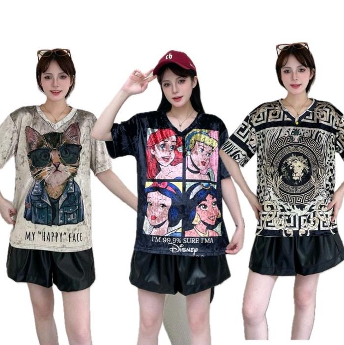 Kaos V neck velvet bludru blouse oversize Printing Motif Wanita
