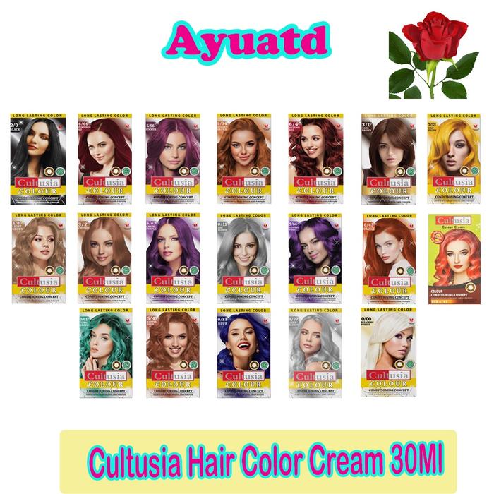 Autumn Red 6/4, Black 2/0, Bleaching 0/00, Blue 0/88, Chestnut 3/2, Coper Gold 5/43, Coral Green 0/61, Drak Brown 3/0, Floweriness Red 6/66, Flowery Purple 5/64, Fuchsia 5/56, Gold Yellow 7/33, Golden Brown 9/34, Grape Purple 5/67, Light Brown 5/0, Orange 0/43, Red 6/45, ash blonde 0/11, light blonde 0/77, mangkok, sisir semir