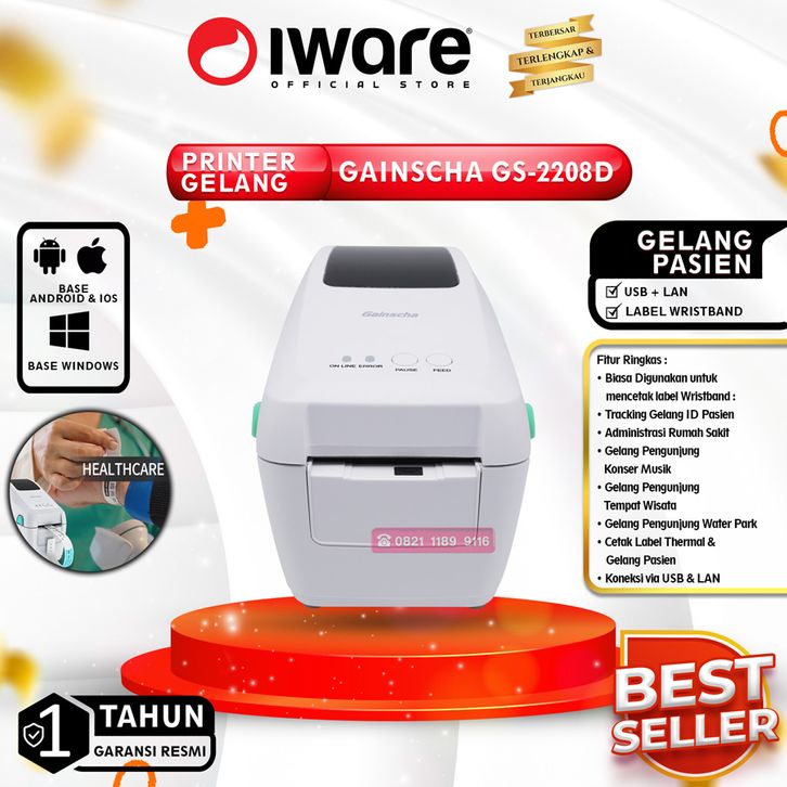 Printer Barc0de Thermal Gainscha GS-2208D Cetak Gelang Pasien & Konser