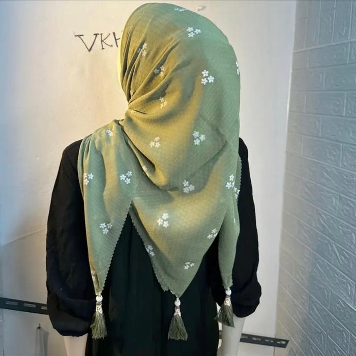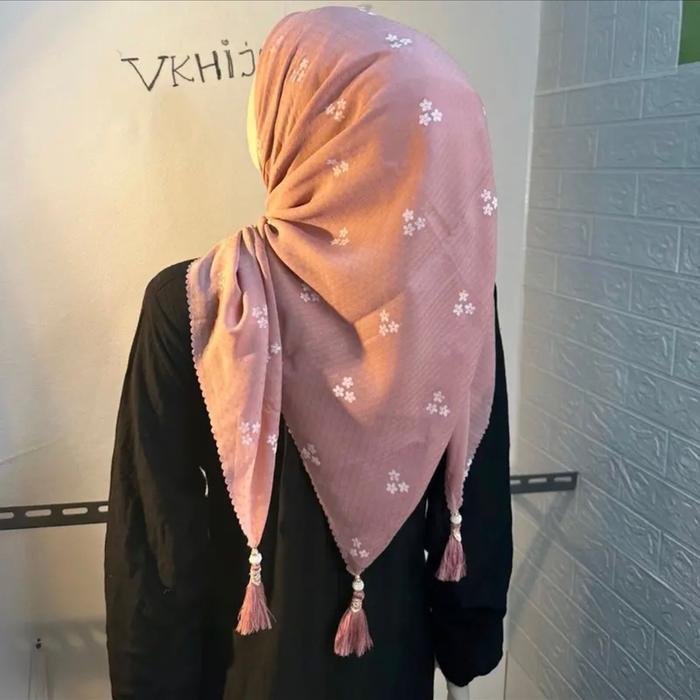 hijab square segi empat tasel motif bunga bintang Size 115 x 115 Kerudung Muslim Cantik - HITAM
