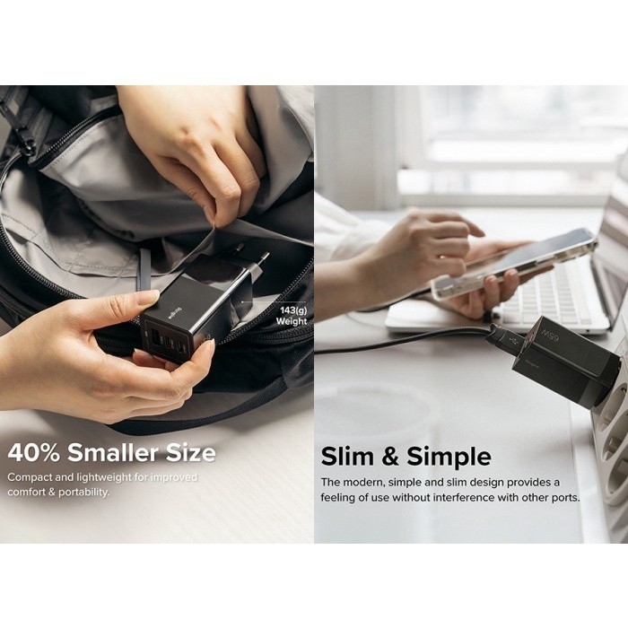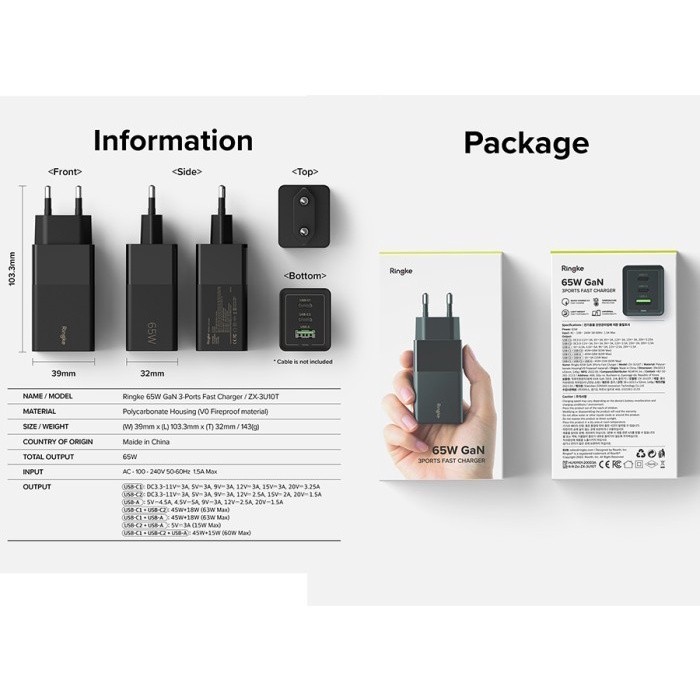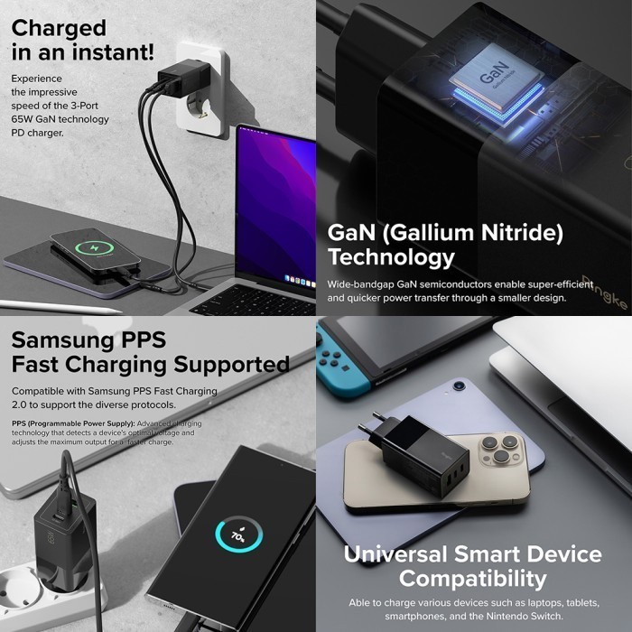Ringke Fast Charger 65W Gan 3 Ports 2C 1A Home Travel Charging Hub