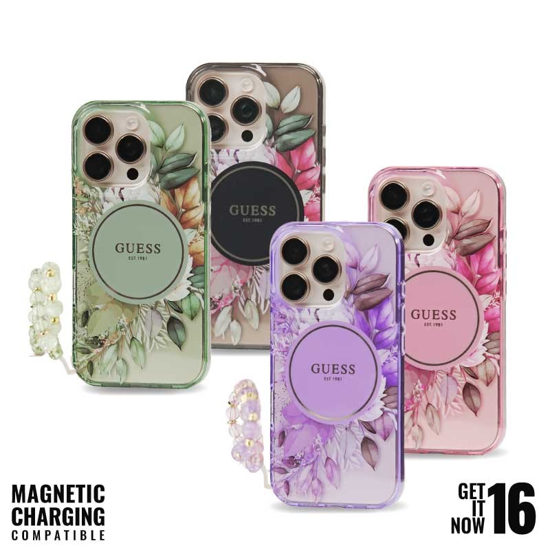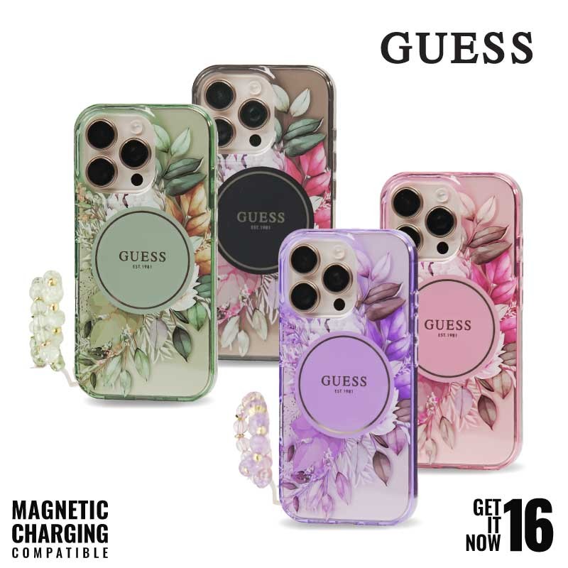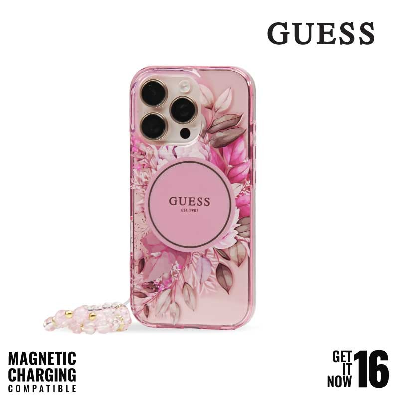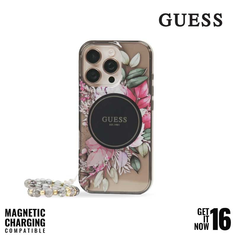 Case For iPhone 16 / Pro / Pro Max GUESS Magsafe IML Flower Pearl Strap