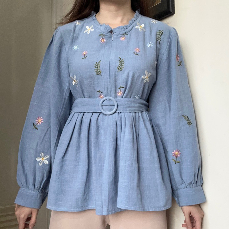 Blouse Wanita Korean Style Reyna Top – Atasan Kemeja Cewek Linen Bordir Import Elegan Casual Kerja Kekinian ALL SIZE