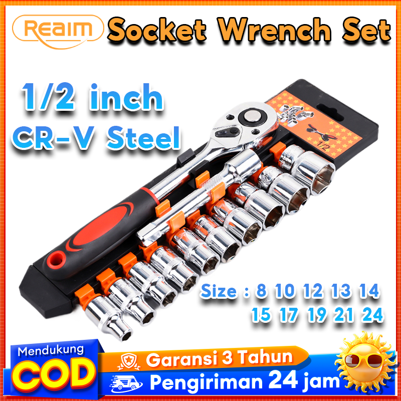 REAIM Kunci Set 1/2inch Socket 12pcs Kunci Sok Wrench Rachet Kunci Socket Motor Lengkap Socket Tool