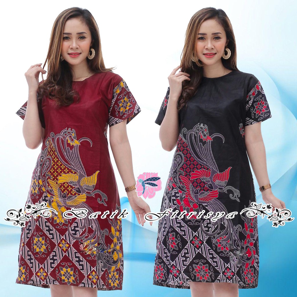 PAKAIAN BATIK WANITA JUMBO DRESS XXXXL / 4L LENGAN PENDEK MOTIF KENARI MERAH HITAM MODEL BARU