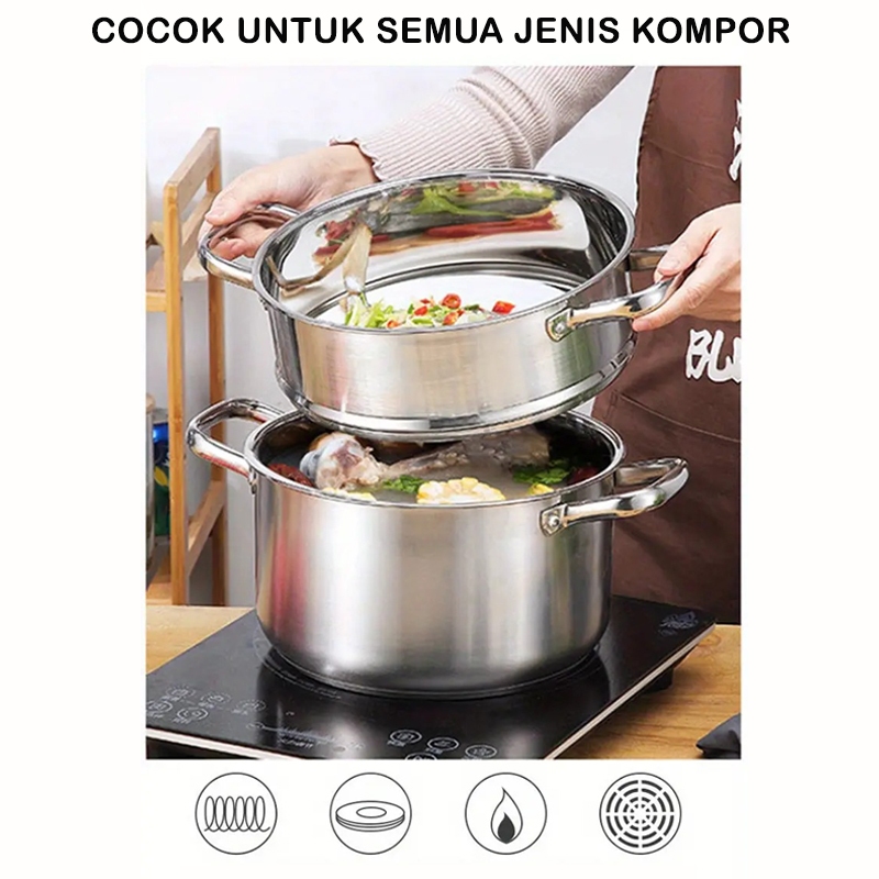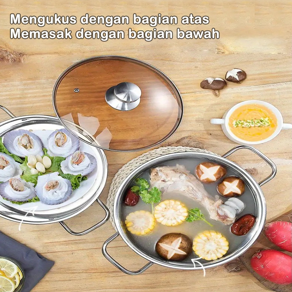 TEXANIA Panci soup 24cm Set Dandang dan Kukusan 2 Susun Full Stainless Steel
