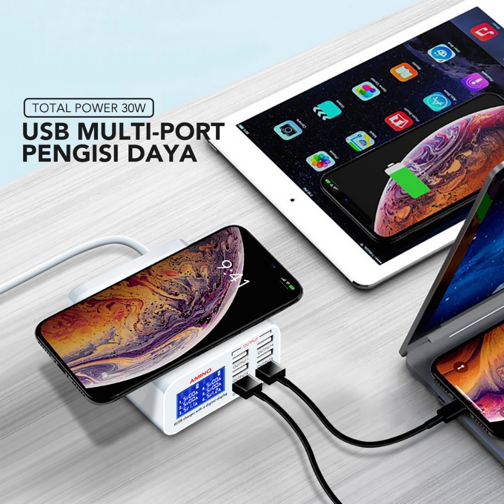 Charger 6 USB Port 87W Super Fast Charging – PD QC 3.0 + Type-C LED Display, Multiport Cas Turbo Aman & Cepat
