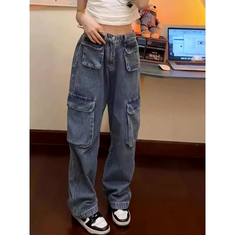 Cargo Denim Putih Highwaist Loose Celana Jeans Wanita Korean (realpict)