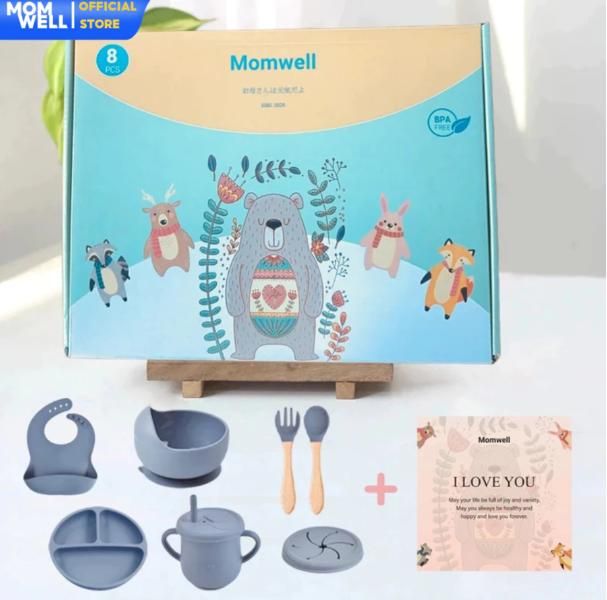 Momwell 8 in 1 Alat Makan Bayi Baby Gift Set Peralatan Makan Silikon Dengan Kartu Ucapan BIB06 - Biru