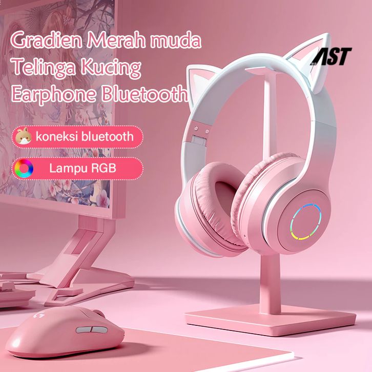 Headphone headset wireless bluetooth Mikropon telinga kucing merah muda Berlaku untuk laptop/komputer desktop/ponsel la