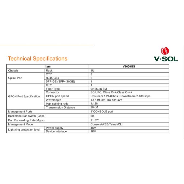 Gpon OLT VSOL V1600GS 1 Port PON 2RJ45 128 User 10GE(SFP+) Uplink termasuk 1 SFP