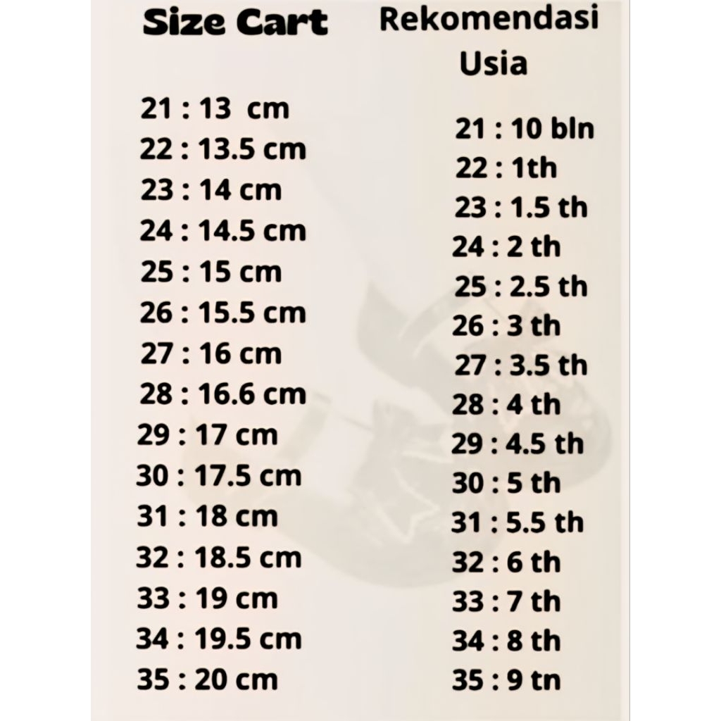 26 (15,5cm), 27 (16cm), 28 (16,5cm), 29 (17cm), 30 (17,5cm), 31 (18cm), 32 (18,5cm), 33 (19cm, 34 (19,5cm), 35 (20cm)