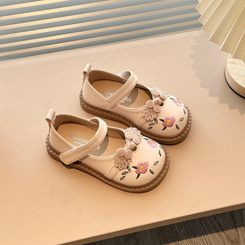 Sepatu Datar Kulit Bayi Perempuan Bunga Bordir Gaya Kuno Sepatu Anak-anak Antilicin Sol Lembut Ujung Bulat Gaya Korea 2-
