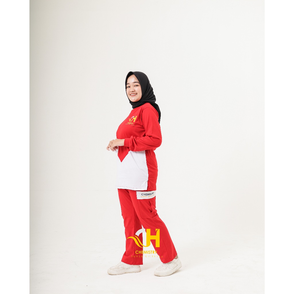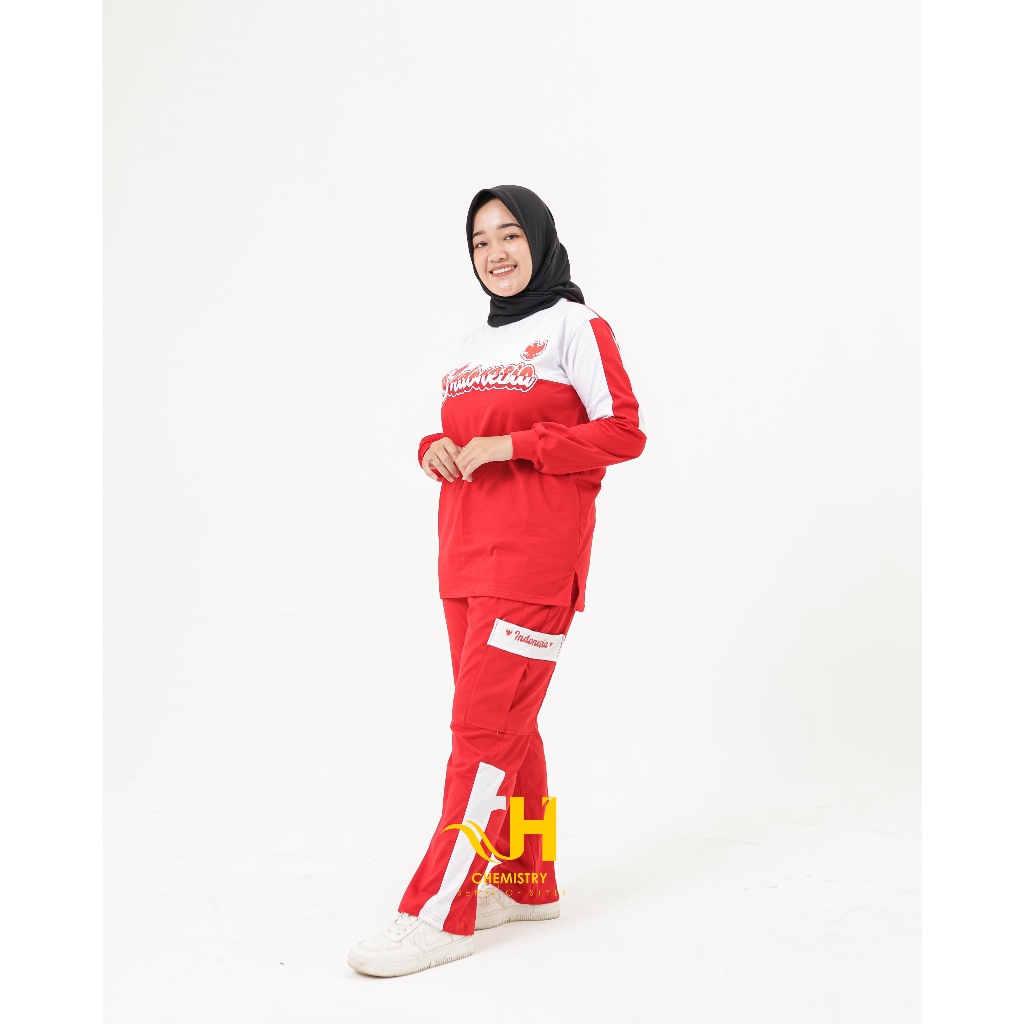 Setelan Olahraga 17 Agustus | Setelan Baju Senam Muslim Wanita Merah Putih