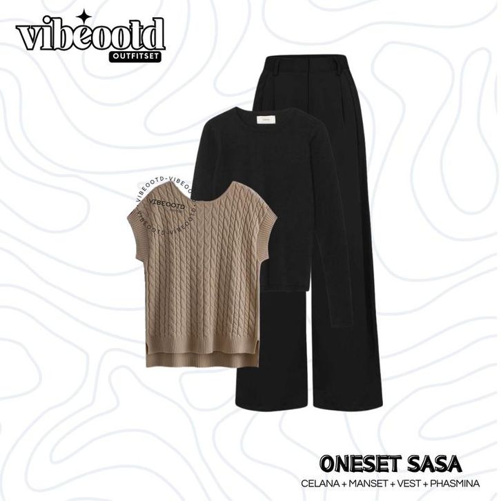 OUTFIT SET WANITA HIJAB ( BAWAHAN CELANA KULOT HITAM + ATASAN INNER LONGSLEEVE + OUTER VEST RAJUT + PASHMINA ) ONE SET O