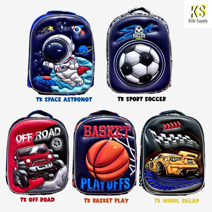 Tas Ransel TK SD Anak Laki Laki Gambar Astronot Mobil Sports Sepakbola Bola Basket Timbul Import