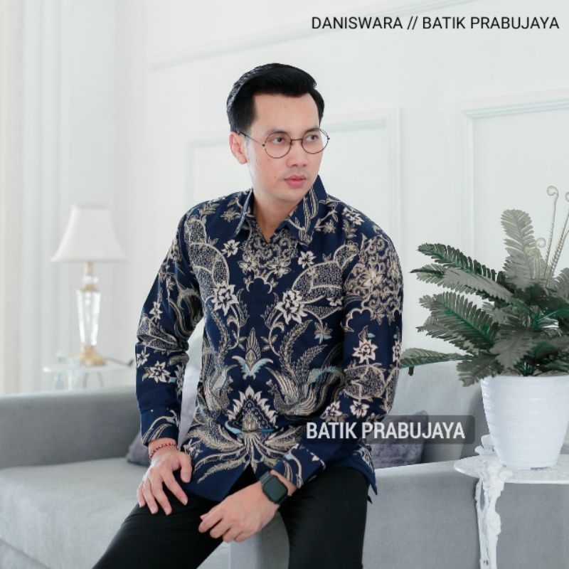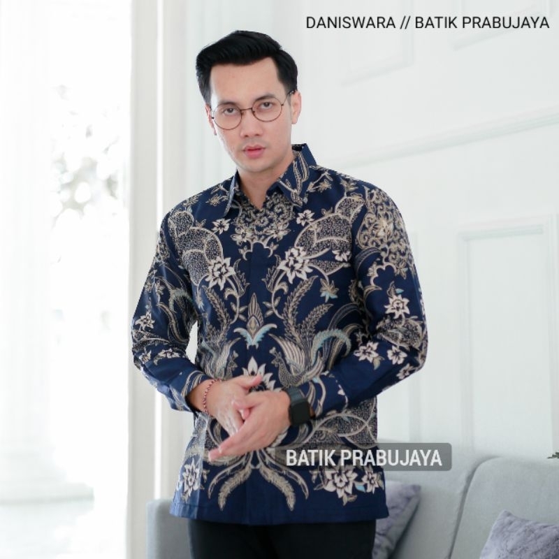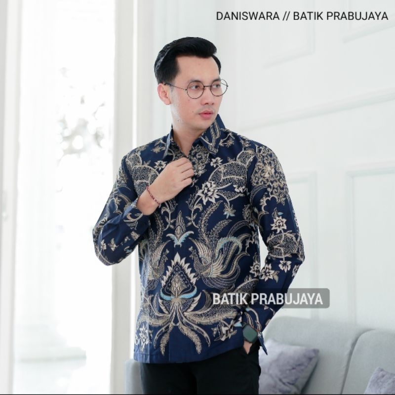 DANISWARA Kemeja Batik Pria Lengan Panjang ern Premium Biru Navy Full Furing Halus Kondangan Kerja
