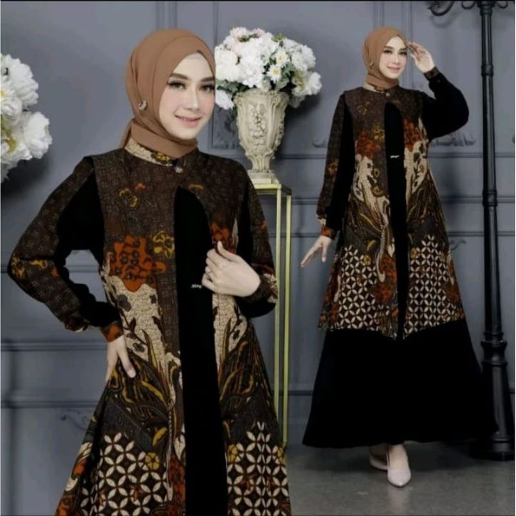 Gamis batik kombinasi polos 2 2in1 jetblack busui terbaru terviral termurah